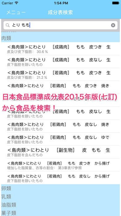 ・食品成分表の最新化、及び追補2016年データを追加しました。(ver 1.1.0)