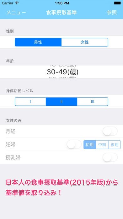 ・「日本人の食事摂取基準」(2015年版)のデータを収録。性別や年齢などを指定するだけで、各栄養素の目標量を設定することができます。設定した目標量に対する充足率も自動計算されます。