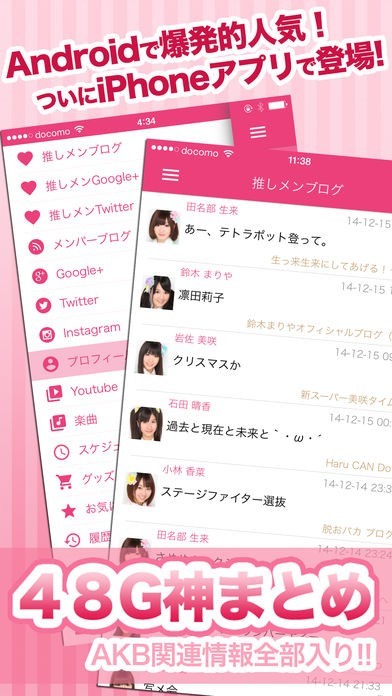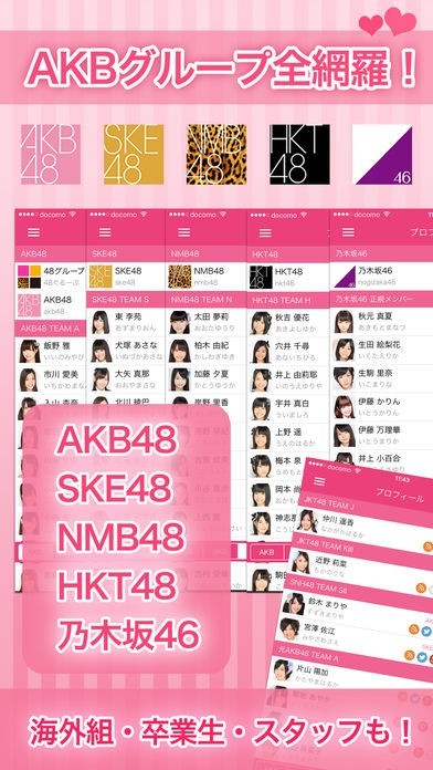 AKBやNMB、乃木坂などAKB系アイドルの最新情報を完全網羅!メンバーのプロフィールやスケジュールをはじめ、ブログ、Twitter、Instagram、Google+、さらには関連ニュース記事や掲示板まとめまであらゆるネットメディアをワンストップで閲覧できるアプリ。全グループまとめて、もしくはグループ別に各メディアの投稿を更新順に並べて表示できる他、メンバーごとの更新状況の一覧、キーワードを指定してのピンポイント検索、ブラウザ経由でグッズの販売ページへのジャンプ、などの機能が搭載されています。