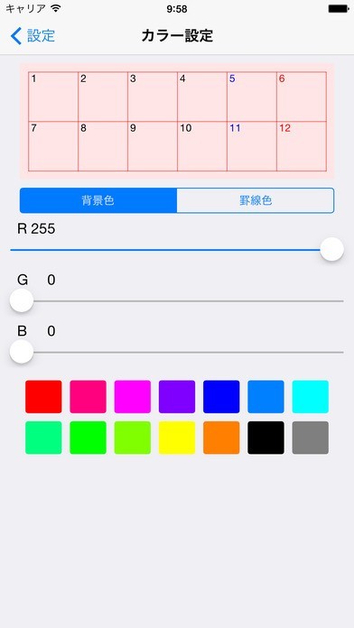カレンダー画面の背景色・罫線色がカスタマイズでき、祝日表示にするカレンダーも選択できます。