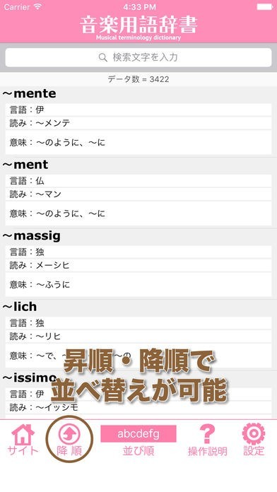 アプリにはソート機能が搭載されており、昇順・降順、単語順・読み順に並び替えることが出来ます。自分が見やすいように並び替えて効率的に音楽用語を学習すると良いでしょう。