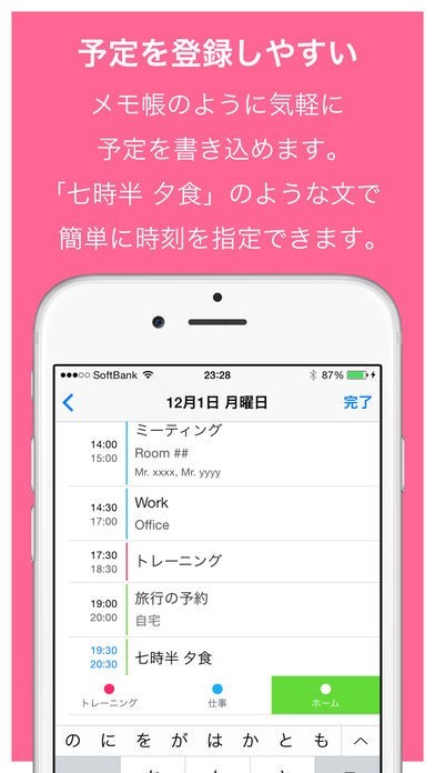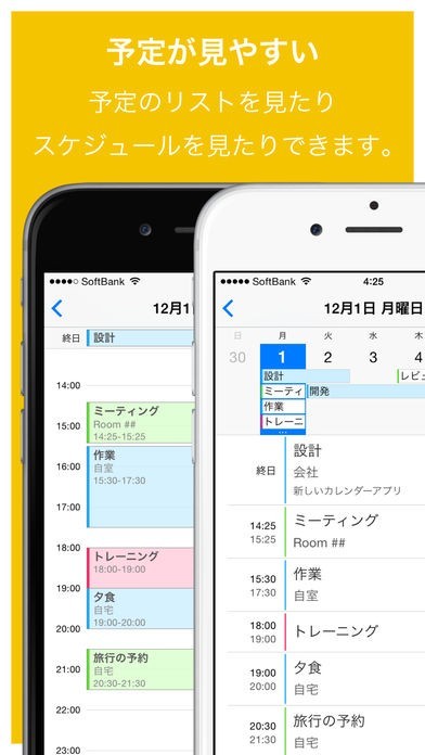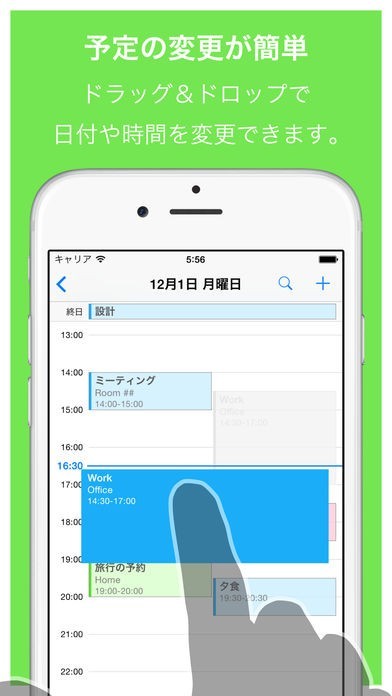 予定リストやスケジュールがまとめて見やすく、イベント登録も時間を入力すると、その時間に登録され、日程変更も手軽にできるので純正カレンダーでできなかったことが簡単に解決します。