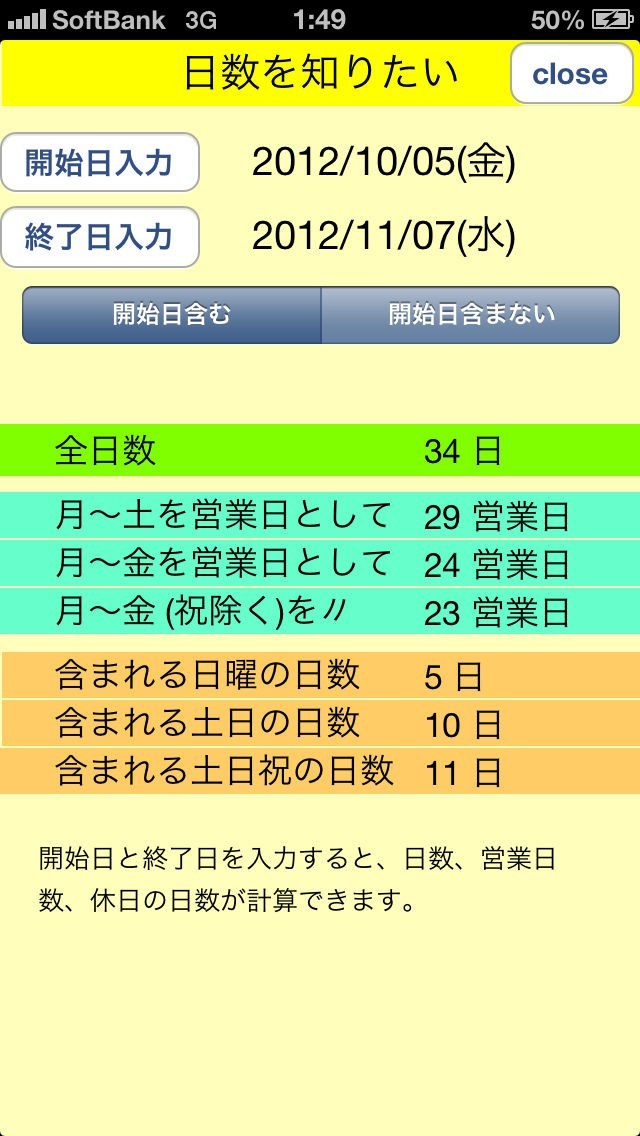 カレンダーを見返して日数を数えたり計算する必要がなくなります。予定が開始する日と終了する日を入力するだけで、休日も含めて何日あるのか計算してくれます。休日の設定の仕方も7パターンあって便利です。