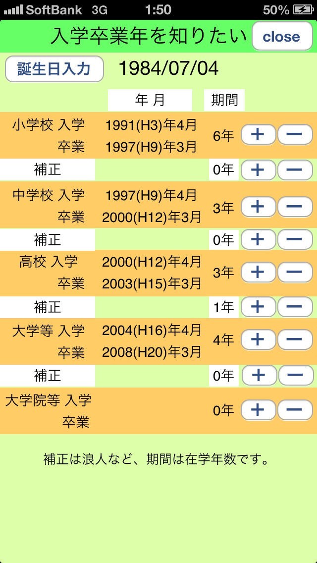 生年月日を入力するだけで、小学校から大学院まで入学年と卒業年を簡単に計算します。履歴書を書くときや、家族のマネープランを考えるときに紙に書いて計算したり調べ直したりする必要がありません。