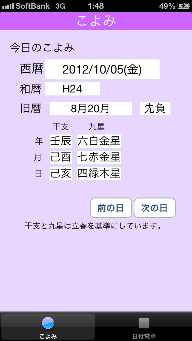 本日の旧暦や六曜、九星も表示OK!タップで前後の日も確認可能!