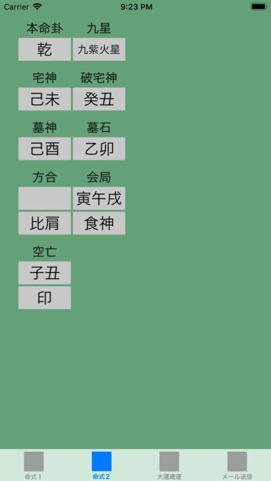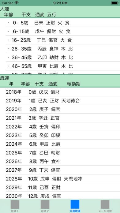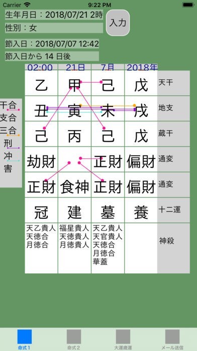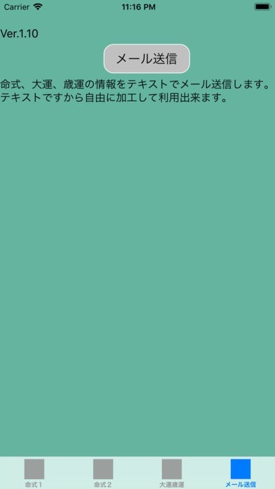 メール機能があります。結果をテキスト形式のメールで送信でき、パソコンなどで自由に加工したり利用したりする使い方もできます。阿部泰山流の命式方法を利用したいときに役立ちます。