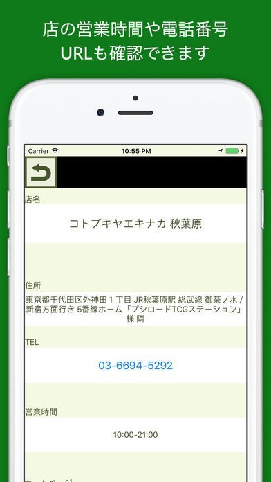 ピンをタップすると「店名」「営業時間」が吹き出しで表示されます。