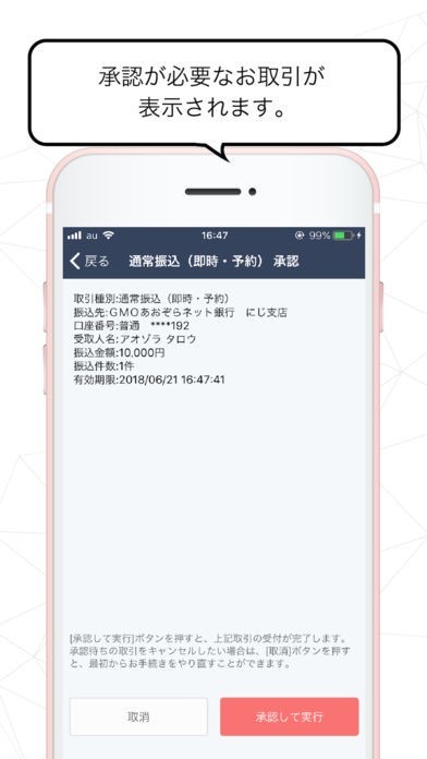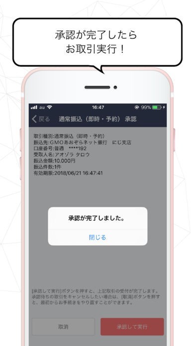 GMOあおぞらネット銀行の認証アプリは、通常の認証に加えてより強固な認証方式であるトランザクション認証にも対応しています。