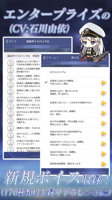 ゲームやアニメには無い、アズレン・エンタープライズのここでしか聴けないオリジナルボイスが200以上収録されています。毎朝好みのボイスをセットして、すっきり起きる事が出来ます。