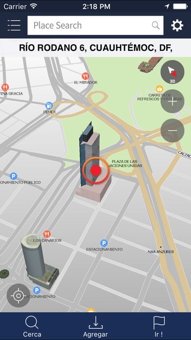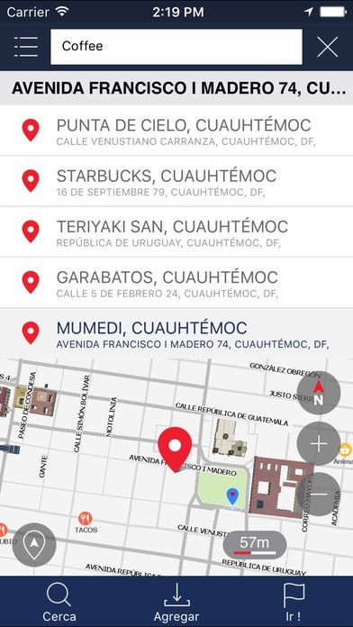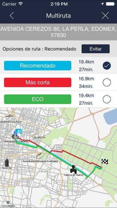 メキシコ国内の住所を入れるだけで目的地をセットできます。住所以外では郵便番号、または地図上の建物からも設定可能なので、正確に行きたい地点までの経路を示してくれます。