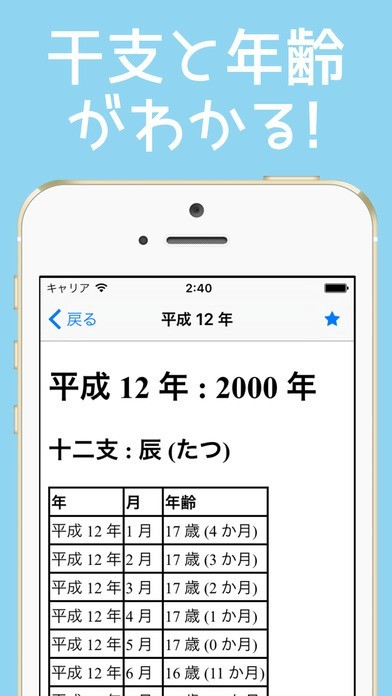 和暦・西暦をタップすることで、干支や年齢の詳細を見ることができます。年齢は月単位まで表示されます。