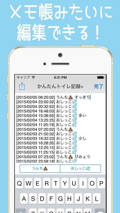 日付と時間を自動で入力でき、日々のトイレをワンタップで記録できます。