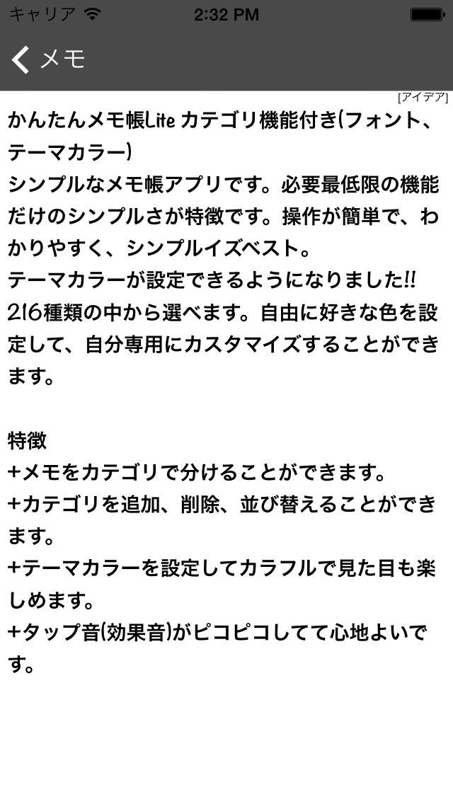 無料版「かんたんメモ帳 カテゴリ機能付き」をご用意しております。購入前にダウンロードしてお使いいただくことをお勧めします。