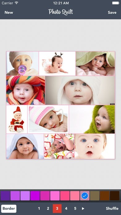 加工アプリ「Photo Quilt」では、使いやすい機能を多数用意しています。メインとなるコラージュ作成機能は使いたい写真をカメラロールから選択するだけと操作も簡単。テンプレートの選択などはアプリが自動的に行ってくれる他、写真の配置も自動で実行されるのが特徴です。出来上がったコラージュ写真を組み替えたい場合には、作成ボタンを再度タップして、納得の1枚が出来上がるまで自動生成を繰り返してみましょう。フレームカラーの選択機能も搭載しており、写真の雰囲気にカラーを合わせられるのも嬉しいポイント。完成作品は共有機能を利用すれば、SNSの友達にも簡単に届けることができます。