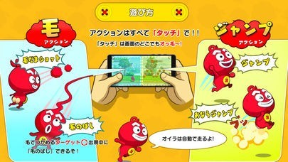 -毛のばし:ステージ途中に木やポールなどの毛でつかめるターゲットが出現。タイミングを合わせて毛伸ばしすれば、大ジャンプなどの爽快アクションが可能に!