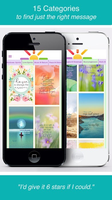 There are 15 Categories for easy browsing. They are: Affirmations, Angels & Blessings, Encouragement, Faith & Forgiveness, Grace & Gratitude, Holidays & Joy, Kindness, Love, Music & Nature, Peace & Silence, Prayers, Scripture, Wisdom & Yoga, For iPad and Home Screens.