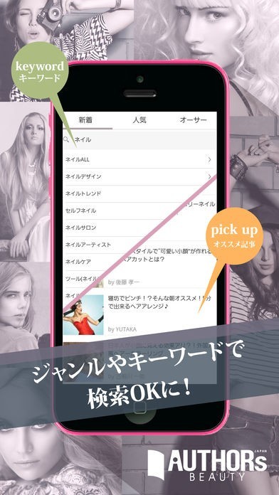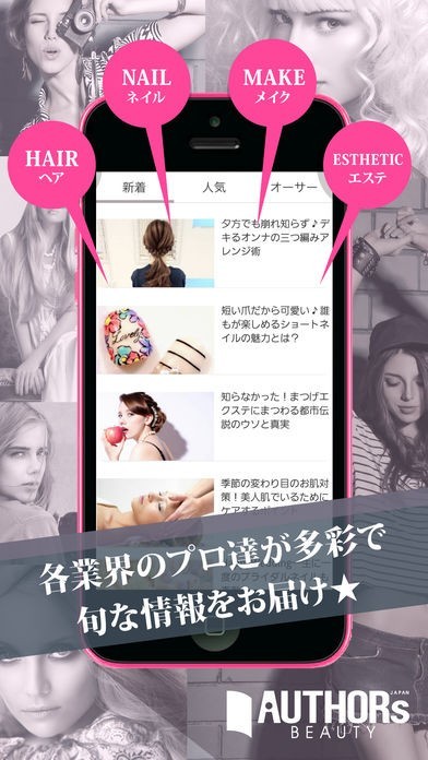 プロフェッショナルによる美容に関する最新トレンド情報をスマートフォンで受け取ることが出来るアプリが「AUTHORs JAPAN BEAUTY」です。ネイルやヘア、メイクなどさまざまなカテゴリーの情報が配信されていて、ジャンルやキーワードによる検索が可能なので自分が知りたい情報をスムーズに見つけることができるようになっています。お気に入り機能で記事ごとにブックマークをしておくことが出来るので後からでもじっくり見直すことが可能です。コラムページは大きな写真つきの解説文を閲覧することが出来るので、読みやすく理解しやすいのが特徴となっています。
