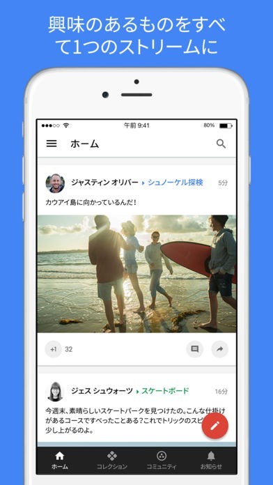 iPhoneを通じて自分の好きなものを発信し共有することができるアプリがGoogle+です。例えマイナーな趣味であっても世界中のユーザーの中から自分と共通の嗜好をもったユーザーとつながることができます。特定のカテゴリごとにコミュニティが形成されているため、情報を発信しなくても仲間に入るだけで自分の趣味の世界を深めることが可能です。写真や動画を共有することで自分たちの体験を持ち寄って楽しめます。また、複数のコミュニティに参加することができるので安心です。