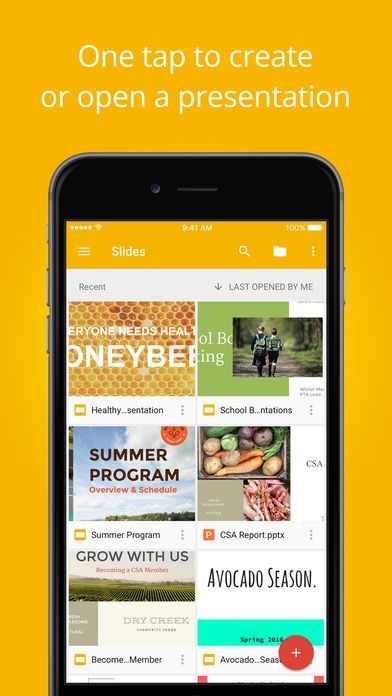 "Googleスライド"は、プレゼンテーションにアクセスして作成や編集が行え、ハングアウトやAirPlayに対応しているので、プレゼンテーション時の配線の手間が省けます。また、オフライン時でも利用可能となっています。作成したファイルは自動でGoogleドライブ内に保存されます。ファイルを編集した際にも、変更内容が自動的に保存されます。変更履歴を使用する事で、以前のバージョンを確認する事も可能です。日付や変更ユーザーでソートをかけられるので、ファイル検索がスムーズに行えます。複数ユーザーとファイルを共有して、共同編集も可能になっています。さらには、Microsoft OfficeのPowerPointで作成した資料の閲覧や編集、保存まで可能です。場所を選ばず、気軽にスマートフォンで、プレゼンテーションの作成、編集を行いたい時や、共同編集を行う際に最適です。