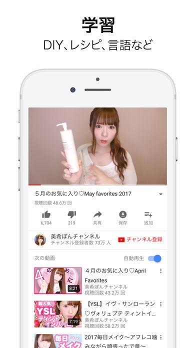YouTube - 映画、音楽 と クリップを利用する事で、色んな種類の動画をいつでも簡単に視聴出来ます。日頃からYouTubeへとアクセスして、様々な分野をパソコンから閲覧する事が多い人達に適した、魅力的な映像配信プログラムです。このアプリをスマホへとダウンロードする事で、YouTubeのサービスを直ぐに受けられます。無線環境が整っておけば、通信制限を意識する事なく、見たい動画を素早くチェック出来ます。ソファーやベッドで寛ぎながら、興味のある映像を効率的に確認出来ます。アプリはYouTubeを再生するだけでなく、以前に拝見した動画を調べたり、お勧め映像を確かめる役立つメニューも備えています。
