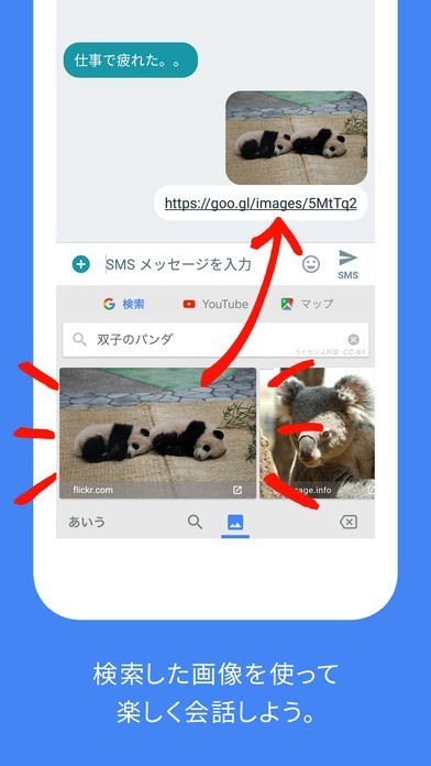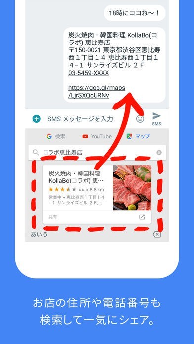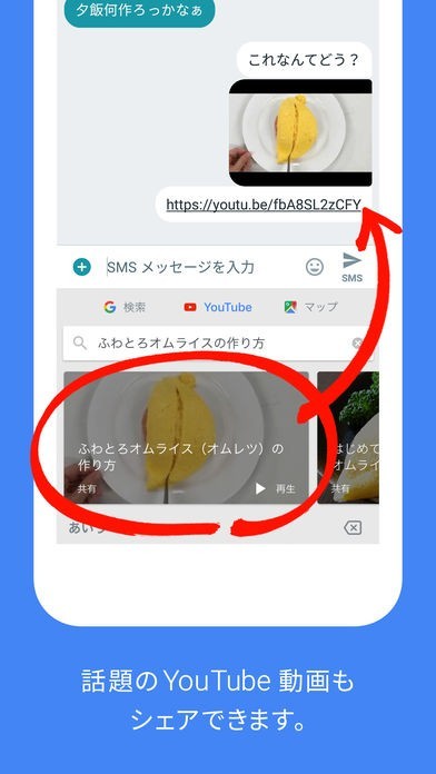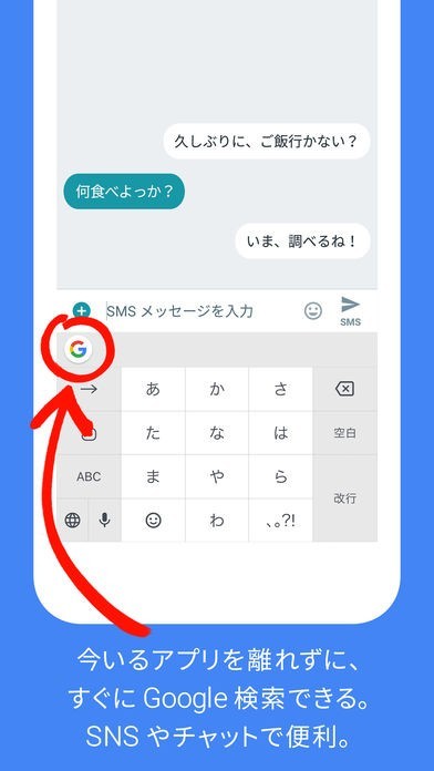 このアプリはパソコンでは多くの方が使っているグーグル日本語入力の機能をスマートフォンに活かしてくれるので、予測変換の精度が高かったり、最新の内容にも対応してくれていることから、時代に敏感な中学生から大学生までの方々でもが使いやすいです。 加えて、「画像検索」なども素早く行えて、出てきた画像をラインやSMSなどですぐに送ることができることから、コミュニケーションを取りやすくなります。 他にもユーチューブの動画なども素早く「共有」することが出来るので、見て欲しいようなものがあったらすぐに多くの方に見てもらうことが可能です。 それ以外にも、「お店の情報を検索」することによってすぐに電話番号や住所などをシェアすることが出来ます。