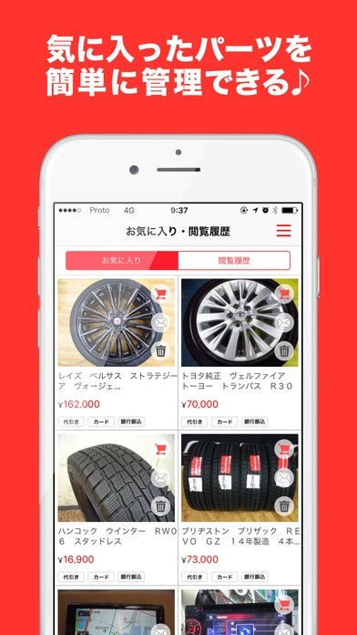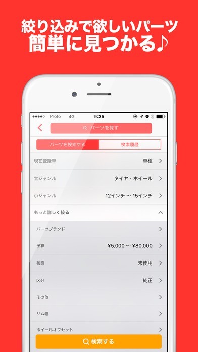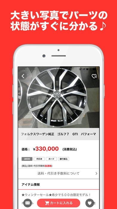 パーツを探している車を登録しておけば、自動でその車に適合するパーツに絞って表示することができるので、パーツ選びが楽になります。写真が大きいのでパーツの状態も分かりやすいです。