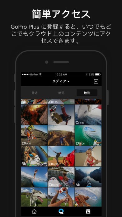 このアプリはGoProで撮影したものをスマートフォンに送ってくれて管理することができるので、その機器を持っている方のみがターゲットとなります。 また、お気に入りのショットをチェックして、ツイッターやフェイスブックやなどに「共有する」ことができるので、多くの人に見てもらえるきっかけにすることができますし、定期的にアップロードすれば、フォローワーが増えたりする可能性も高まります。 他にも、GOPRO自体の撮影開始や設定の変更などを行うことによって、よりよい撮影をすることもできるようにしてくれます。 さらにはデータは自動でクラウド上にアップロード出来るので、「バックアップ」を勝手に行ってくれて、データを失う心配をする必要は全くありませんし、クラウドから写真などを閲覧することもできますし、パソコンから管理することも容易に行なえます。