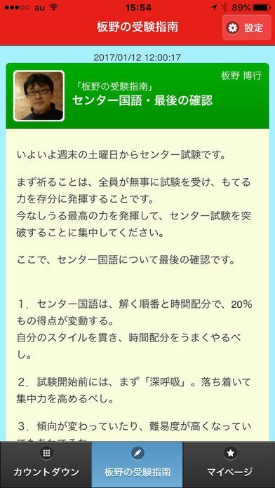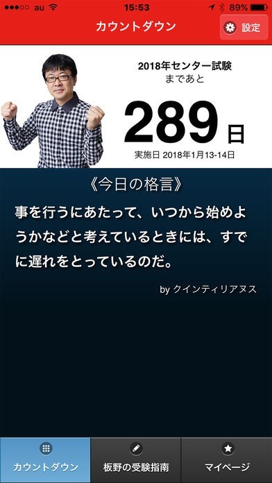 「日めくりゴロゴ」は大学受験のためのセンター試験やその他試験までの日数をカウントダウンすることで、大学入試や資格試験などの受験生が勝負の日に備えることをサポートしてくれます。カウントダウン機能が対応しているのは、2019年のセンター試験および2020年内までの任意の日時の試験。試験の選択や設定はカウントダウン画面右上の設定ボタンから行うことができます。また英語や国語の小テストが毎日のように配信される学力アップのための機能「板野の受験指南」では、設定ボタンを押すと小テストを表示する科目や先生を選択することができます。試験本番までのカウントダウンで気持ちを盛り上げると同時に計画的に準備しましょう。