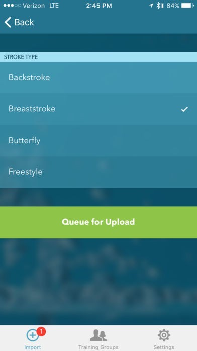 • The app presents a list of strokes (e.g., freestyle). Click the appropriate stroke and queue the video for upload.