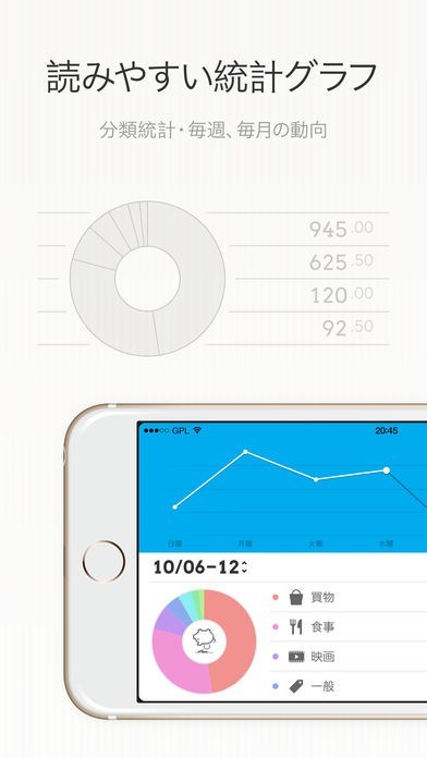 統計グラフ機能があります。1週間や1ヶ月毎の支出を円グラフで表示することができます。フリックで切り替えができるので、操作は簡単です。項目ごとに色分けされており、支出の割合がわかりやすいです。