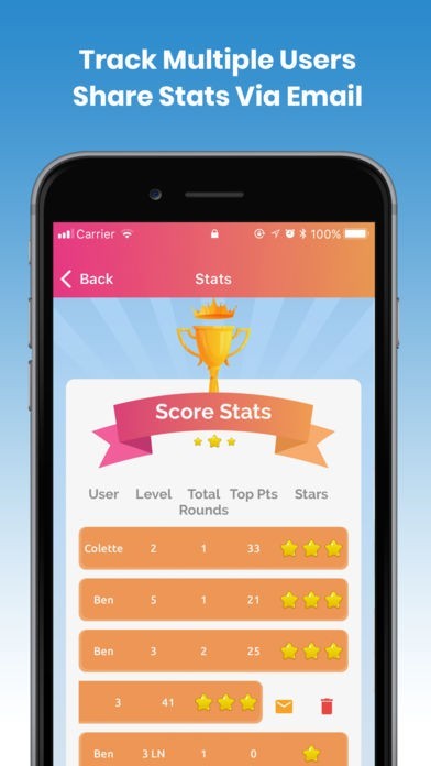 - 統計ページはスコアボード上の各ユーザーの進捗状況を示しています。左にスワイプすると、あなたはそれをあなたの教師/保護者と共有することができます。
