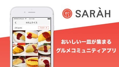 「グルメアプリ「SARAH(サラ)」一品からレストラン検索」は、メニューからお店が見つかるレストラン情報アプリです。 検索機能を搭載しており、カレーやナポリタン、トンカツなど、一品メニューから店舗検索が可能。 おすすめのお店は投稿機能で皆に知らせることができる他、フォロー機能を利用して好みのユーザーをフォローすることもできます。