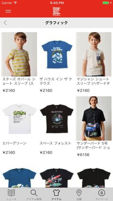 スマートフォンからデザインTシャツのパイオニアであるgraniphの最新アイテムをチェックすることが出来る公式アプリとなっていて、カテゴリー別に表示することも可能です。