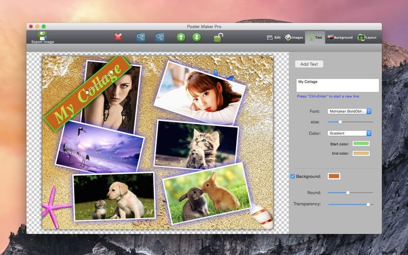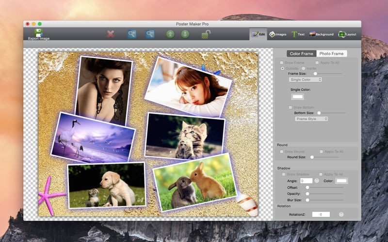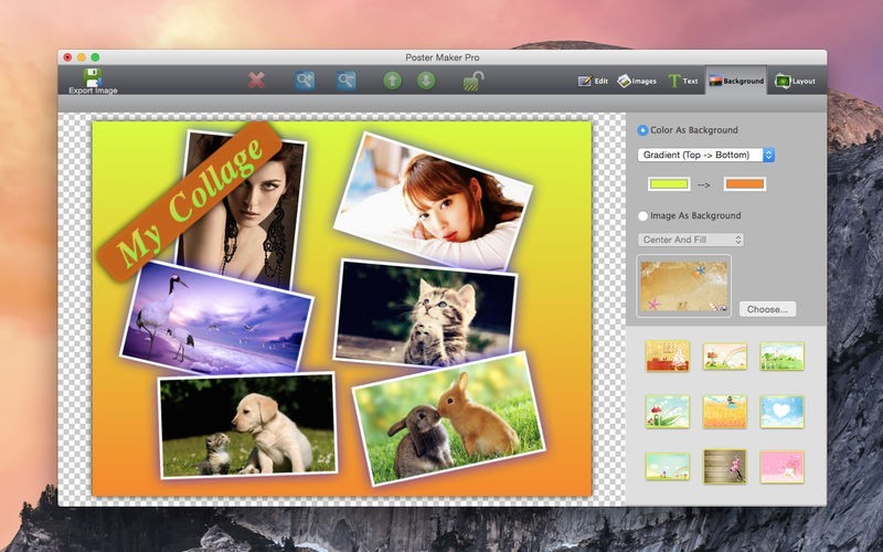 Find out just how easy it can be to turn photos into a collage! Create stunning picture collages on your Mac. Tie fond memories together into gorgeous picture mosaics. Photo Collage Pro is the app for quickly assembling your pictures into great-looking collages. With an intuitive interface, Photo Collage Pro gives you complete control over your collage design.