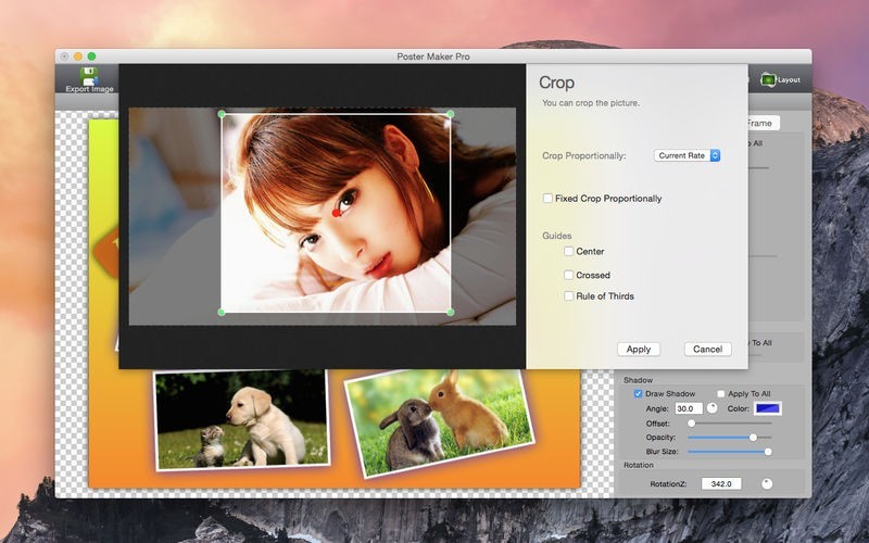 Photo Collage Pro allows you to easily adjust every image (Zoom and Pan), Crop Image and apply artistic effects for every image. Allow you to plane rotation every image and add color border.