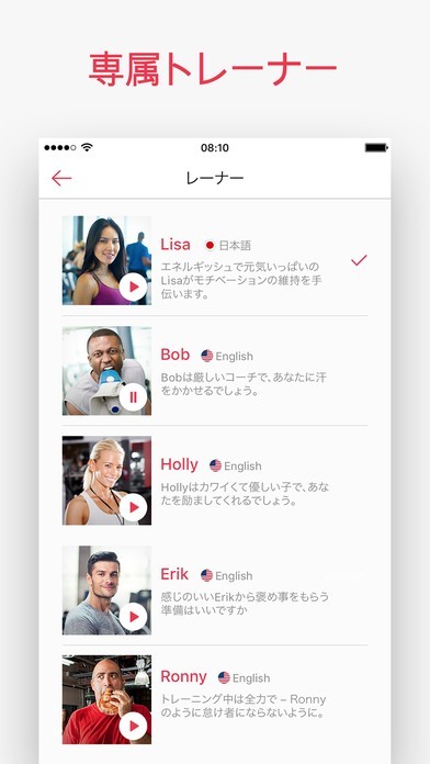 トレーニングメニューごとのポイントを教えてくれたり、励ましのメッセージを投げかけてくれます。自分の好きなトレーナーを選べる機能が秀逸で、やる気を保つポイントとなります。