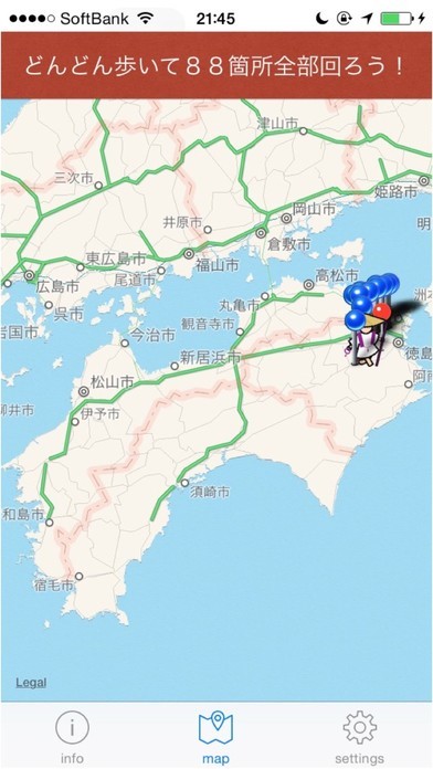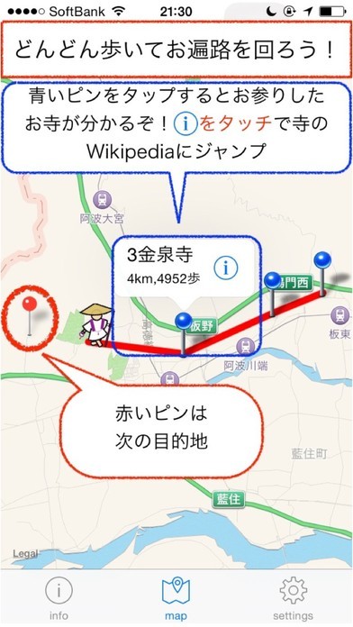 お遍路さんのキャラクターが使用者の歩いた歩数の分だけ八十八ヶ所のお寺を回ってくれるから実際に四国に行かなくてもお遍路さんになってお寺を回った気分を味わうことができます。