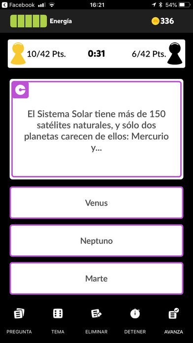 - Aprovecha los maratonios para usar herramientas que te hagan más competitivo en el juego, cambiando de pregunta, cambiando de tema, deteniendo el cronómetro, eliminando una de las opciones y ¡avanzando sin contestar!