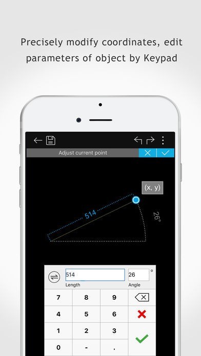 このアプリではCADデータを編集したり閲覧することが出来ます。座標のポイントは正確に数値を入力する事も出来ます。また指で座標点をタッチする指操作も可能です。非常に便利なアプリです。