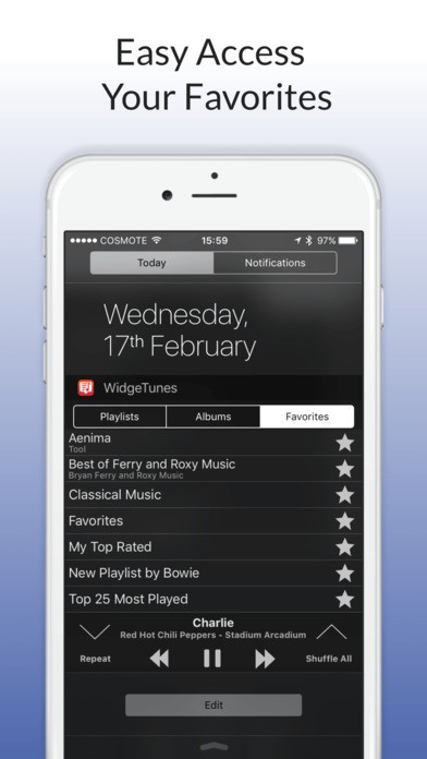 WidgeTunes is the easiest way to play music on iPhone. Just swipe down from the top of the screen on your iPhone and select a playlist or album from WidgeTunes widget.