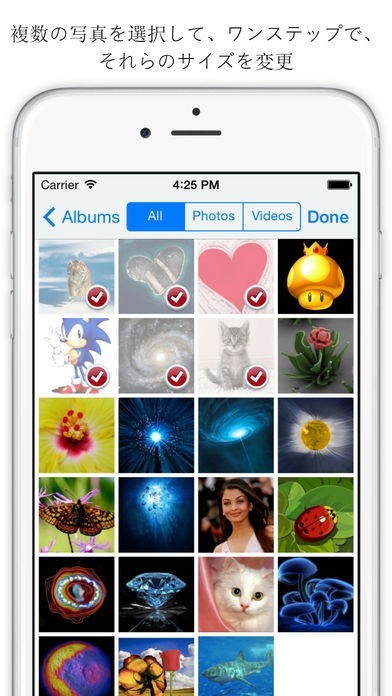 Choose your images directly from your album and adapt the size in any order. The original data won't be changed.