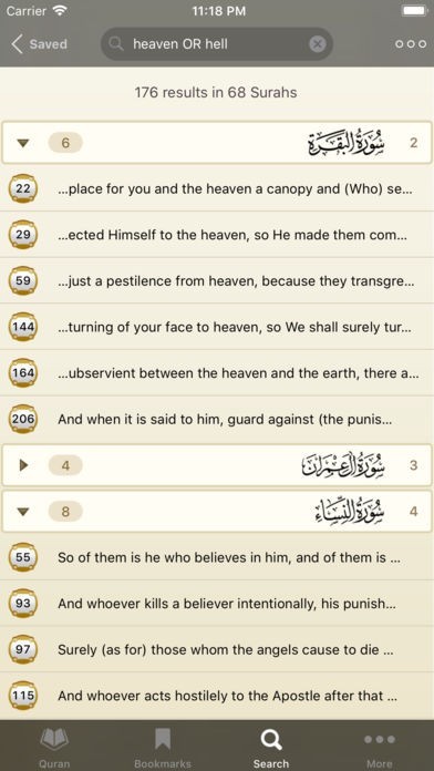 「iQuran Pro」にはコーラン全文がアラビア語と英語で掲載されています。また、コーランをアラビア語で朗読してくれますので目と耳でコーランを学べます。朗読音声データを全てダウンロードするので読み上げる節を選択したらすぐに音声が再生されます。そのためネット環境や接続状況によってアプリが使えなくなることはありません。