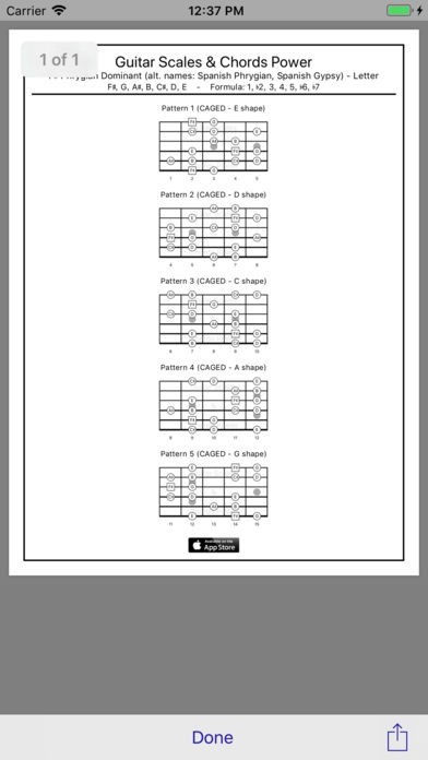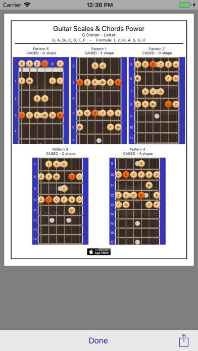 Create 8.5” x 11” PDF diagrams (color and b&w versions) of scale positions or all notes on a full fretboard; also, all chord notes on a full fretboard. Easy to print, save & share PDFs with iBooks, email, AirDrop & Messages.