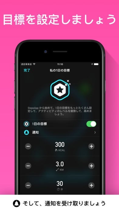 達成できそうな目標よりも少し高めの目標を設定し、コツコツ続けることで自分に対して厳しくなることが出来ます。一日の目標達成後には通知が来るので、モチベーションにもなります。