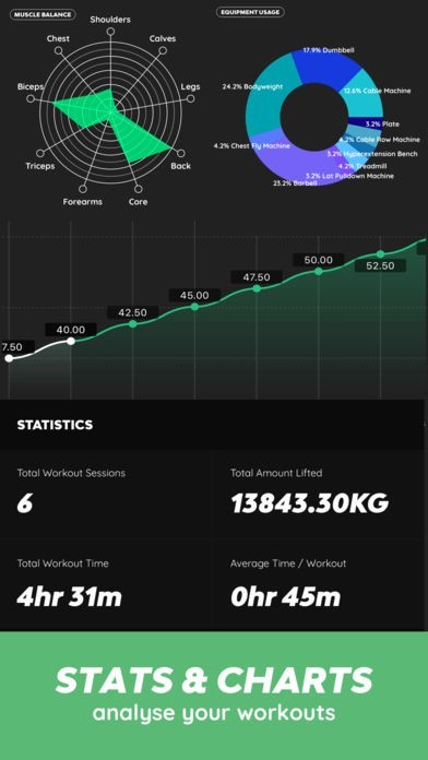 - Progress Section : See a percentage break down of your gym equipment usage (e.g. 25% Dumbbells, 12% Bodyweight, 15% Elliptical...)
