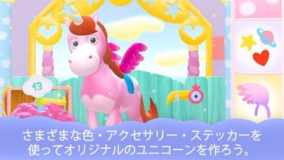 App Storeより引用『Unicorn Glitterluck(ユニコーン・グリッターラック)』は、魅力と夢がいっぱい詰まった幼児向けの3D知育アプリです。さまざまな種類の色、アクセサリー やステッカーを使って、子供たちオリジナルのユニコーンを作ることができます。