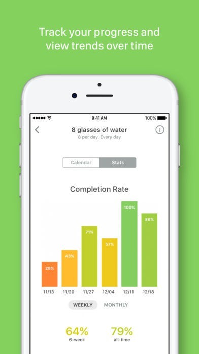 自分が作った予定をどれだけ実行できたか、このアプリを使い続けることで毎週、毎月という間隔でまとめて表示してくれます。バーの色は緑色から赤色ので見やすく、視覚的に示し達成感をもたらしてくれますから、効率化を図ることが楽しくなってきますね。