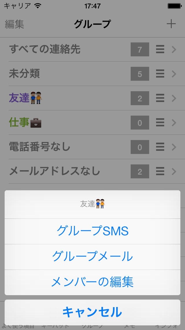グループに対して新規作成、編集、削除、グループの色の変更、グループメールの作成、グループSMSの作成の操作を行うことができます。その上、便利な「メモ帳」と「よく使う項目」の機能も搭載されています。