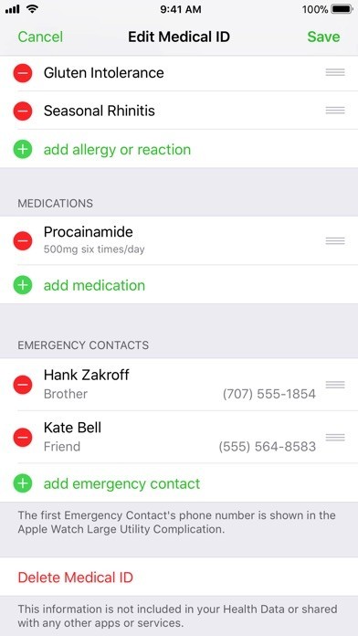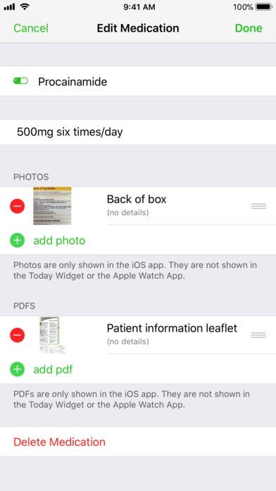 Enter Personal Data, Medical Conditions, Notes, Allergies & Reactions, Medications, and Emergency Contacts on the iPhone/iPad. Attach photos from the camera or photo library. Attach photos or PDFs by importing them from iCloud Drive, Dropbox etc. or dragging and dropping them from other iPad apps.