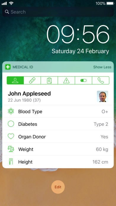 A Watch app gives access to your Medical ID without having to unlock your phone. A Widget is also available and your iPhone/iPad can be configured to make this accessible from the lock screen. Note: for space and usability reasons, photos and PDFs are not included in the Watch App or Widget version of your Medical ID.